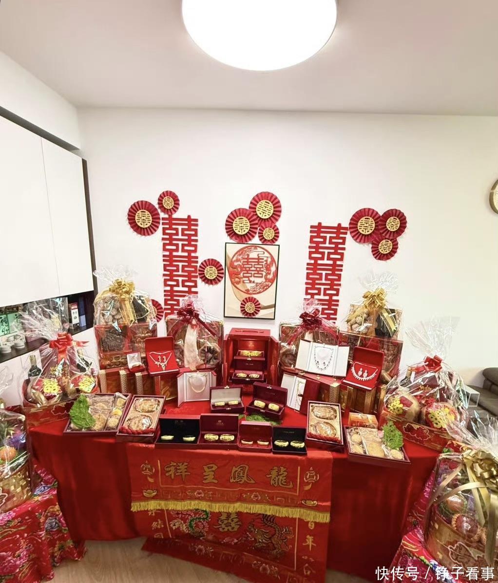 最近他又跟网友分享好消息,说已经办完过大礼的仪式了。从他发的动态能看出来,这次真是下了血本,准备了八对龙凤手镯,还有各种鲍参翅肚、心形花胶,金链和钻饰也特别惹眼。按当地的传统,过大礼得把东西摆满一整张桌子,还得铺块红布图个喜庆。结果他不光摆满了桌子,连屋子里都堆得满满当当的,难怪他岳父岳母笑得合不拢嘴,墙上还贴了好多 “囍” 字添喜气。 他和未婚妻还专门在这些大礼前面拍了合照,俩人都没特意打扮,就穿了身休闲装,看着就很舒服。容天佑这准新郎还是那么帅,咧嘴笑的样子特别招牌,他未婚妻披着长发,看着特别有女人味。 有不少网友说,他未婚妻肤色稍微有点暗,有点东南亚人的感觉,估计是私下里爱运动,不然身材也不会这么好。除了小两口的合照,他还跟女方家人拍了照,看来早就融入人家家里了。听说当初求婚的时候,他还特意先问了女方父母的意见,二老点头了他才敢行动,还挺懂事的。 容天佑自己也说过,当时求婚没搞啥隆重的场面,就是俩人一起遛完狗回家,他突然就跪下求婚了,他女朋友立马就答应了。过程虽说挺平淡的,但看着特别温馨感人。 其实这也特别符合他的性格,毕竟他这人本来就内敛,当初追女朋友的时候都害羞得不行,还得靠好兄弟帮忙助攻呢。现在能顺利娶到喜欢的人,估计他那些好兄弟也没少出力。 现在容天佑主要心思都在筹备婚礼上,他说找了有经验的朋友帮忙,一切都还算顺利。不过眼看着婚礼要到了,他也特别紧张,总怕哪个环节出岔子,或者招待不好请来的宾客。